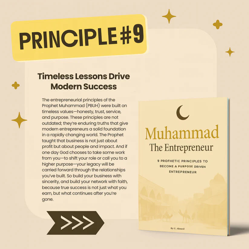 Rooted in years of research and a passion for bridging faith with enterprise, this book is a blueprint for modern Muslim entrepreneurs. It brings you nine timeless principles inspired by the Prophet’s business life — from building trust and leading with vision to creating legacy-driven wealth.